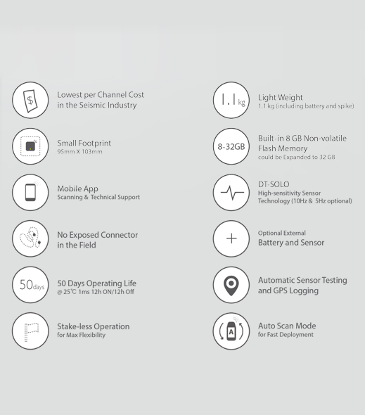 يلبي جهاز استشعار الزلازل سمارت سولو الاحتياجات واسعة النطاق وعالية الكثافة والفعالة من حيث التكلفة لصناعة الاستكشاف الزلزالي. يمكن أن يكمل جوهر الاستكشاف الزلزالي — 3 واط (موجة ، متى ، أين) ، أي إشارة موجة زلزالية عالية الدقة ، ووقت بيانات دقيق وموقع. تنقسم المعدات الطرفية إلى: مركز إدارة البيانات (DMC) ، مركز جمع البيانات (DCC) ، حامل تنزيل البيانات (DHR). تنزيل البيانات عالي السرعة هو 240 غيغابايت / 7 دقائق ، 3000 قناة @ 20 يوم @ 2 مللي ثانية <3.5 ساعة.